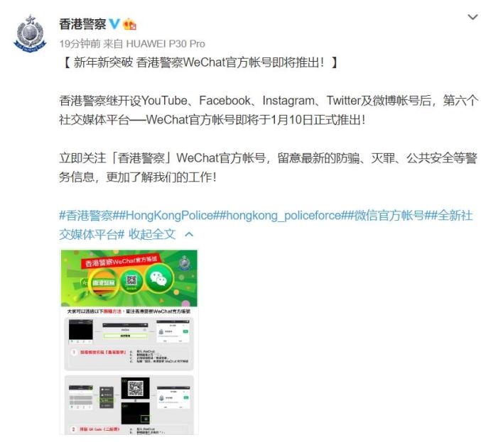 @ Hong Kong Police said in the blog post that after the Hong Kong Police opened YouTube, Facebook, Instagram, Twitter and Weibo accounts, the official account of ——WeChat, the sixth social media platform, will be officially launched on January 10th! Immediately pay attention to the official account of "Hong Kong Police" WeChat, pay attention to the latest police information such as anti-fraud, crime prevention and public safety, and learn more about our work!